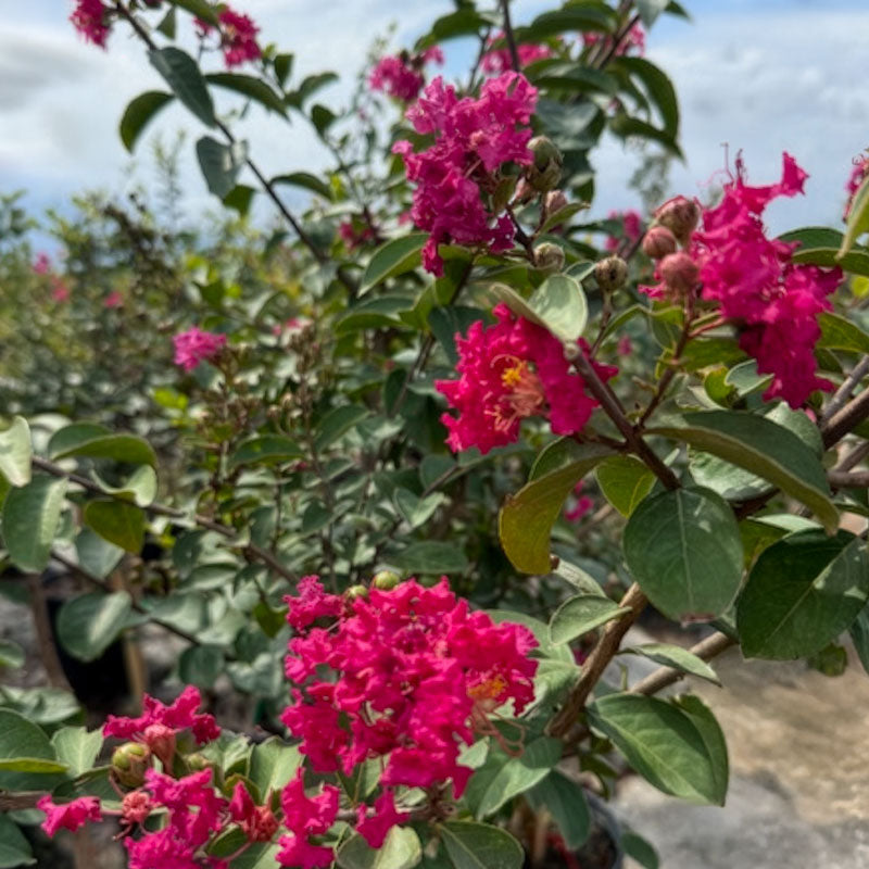 Tonto is a compact crape myrtle with vivid magenta-red blooms that appear mid to late summer. Its rounded habit and moderate size make it an excellent option for smaller spaces, container use, or as a bold border accent.